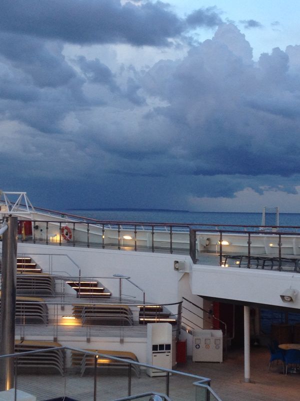 Sono le 16.30 passo dal buffet della merenda solo x fare le foto e mi riprometto di non toccare nulla..bene ho resistito. Prendiamo ancora un po' di sole e poi alle 18.15 cena. Alla sera bello spettacolo di musica anni 70/80. Giro x negozi e uno sguardo al cielo che ci mostra un tramonto quasi sereno a sx e un temporale a dx. Stasera l'ora andrà spostata un'ora avanti, ormai due rispetto all'Italia. Domani la tappa più attesa San Pietroburgo x la quale abbiamo optato x un'escursione tutto il giorno con la Pecora Verde