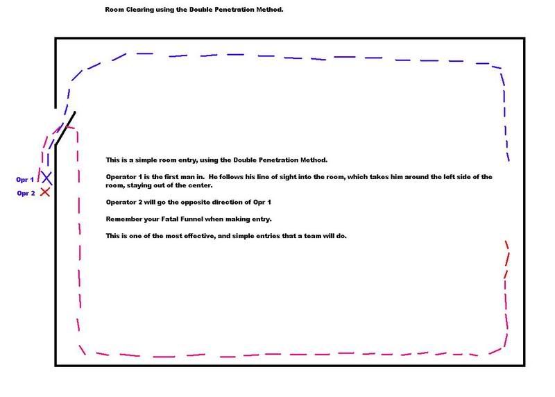 Once you make your entry, you will proceed to the back wall, making sure you check the corners, behind the door, anywhere an enemy may be lurking. Your primary goal is to make it to the back of the room. While you are clearing and you reach the back wall, make you a quick turn around, making sure NOT to muzzle your partner and check the opposite wall... remember, when making entry, GET CLEAR OF THE FUNNEL!!!!!!!!!! Move fast, and don't sweep with your weapon, keep it trained forward, and use your head to sweep side to side.