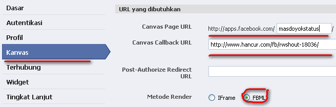 6. Pada canvas page URL isi dengan yang Anda inginkan. Misal saya isi dengan masdoyokstatus maka nantinya alamat aplikasi berada pada alamat http://apps.facebook.com/masdoyokstatus/