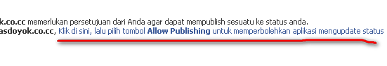 Akan muncul kotak dialog perizinan perubahan status, silahkan klik Izinkan. Maka, Anda akan berada pada halaman untuk merubah status Anda, cukup isikan pada kolom yang tersedia lalu tekan tombol Update Status Anda. Silahkan cek dinding facebook Anda dan hasilnya seperti gambar di bawah ini.